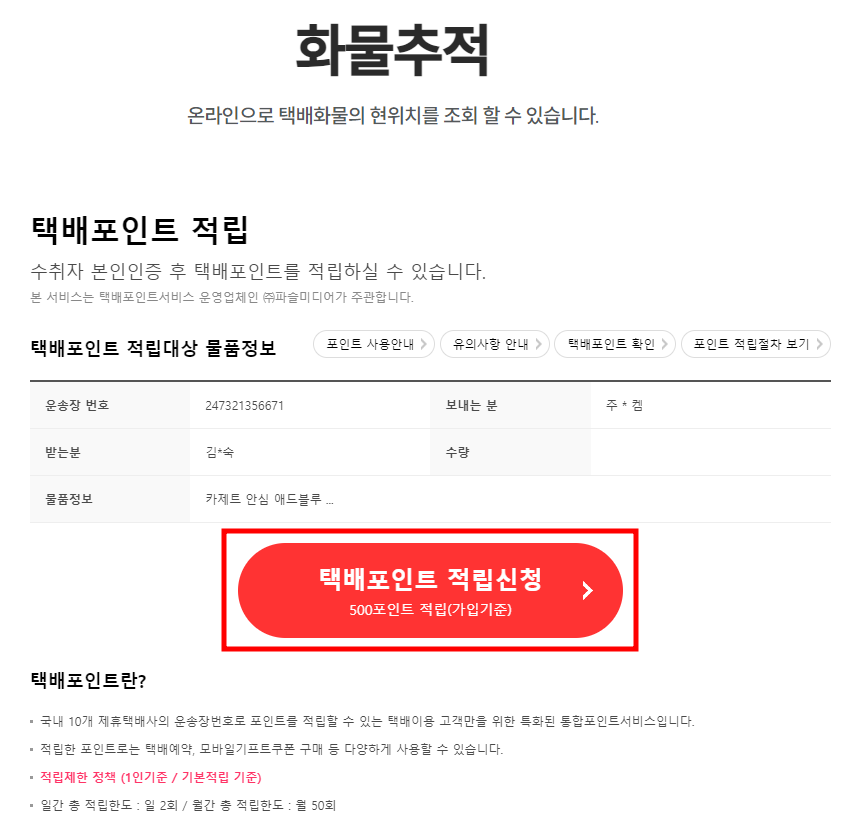 4. 택배포인트 적립신청 버튼을 클릭합니다. 포인트 적립완료됩니다.