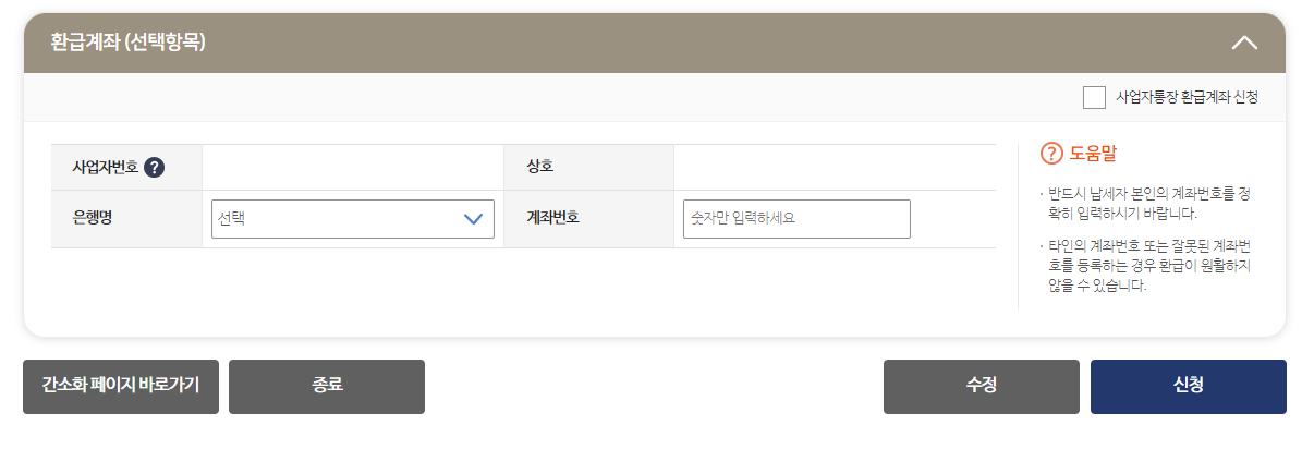 나타난 내용이 맞으면 환급계좌를 입력하고 신청버튼을 클릭합니다.