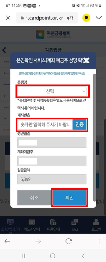 9. 계좌 예금주 성명 확인 화면이 나오면 입금은행명과 계좌번호 입력 후 인증버튼으로 확인하신 후 아래 확인버튼을 누르시면 입금이 완료됩니다.