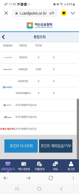 6. 카드포인트 통합조회 버튼을 클릭합니다. 그러면 가지고 계시는 카드 포인트 금액들이 조회됩니다.
